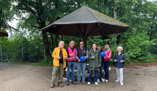 Bis Samstagmittag stand noch nicht fest, ob das Boule-Spiel aufgrund der Witterungsverhältnisse stattfinden könnte. Aber dann hörte der Regen auf und es gelang uns, einige Besucher für das Boule-Spiel zu gewinnen. Einige interessierten sich auch für die ausgelegten Spielregeln und für unsere DFEV-Flyer.